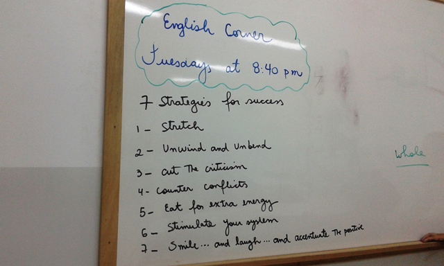 Outra novidade é o “English Corner” (Cantinho do Inglês) às terças, cujo 1º encontro realizado em 02.08.16, com o tema “sucess over stress”. Nos intervalos de terça, a Professora Luciana Azeredo promoverá bate-papos descontraídos em língua inglesa com o objetivo de possibilitar a prática linguística dos alunos que já falam o idioma e também de motivar os que ainda não iniciaram seus estudos ou estão nos níveis iniciais. O projeto visa também ressaltar a importância da aprendizagem de línguas estrangeira para ingresso ou permanência no mercado de trabalho.