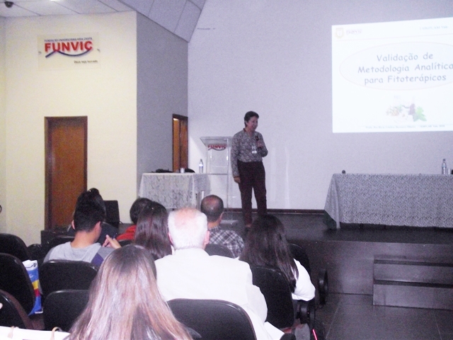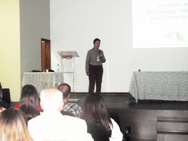 Já no início da noite, aconteceu a palestra “Validação de métodos analíticos aplicados a fitoterápicos”, com a Dra. Maria Cristina Marcucci Ribeiro, professora do Programa de Mestrado Profissional em Farmácia e Mestrado e Doutorado em Biotecnologia UNIAN-SP e pós-doutorada no Laboratório de Fitoquímica do Centro de Edafología y Biología Aplicada del Segura, Murcia, Espanha.